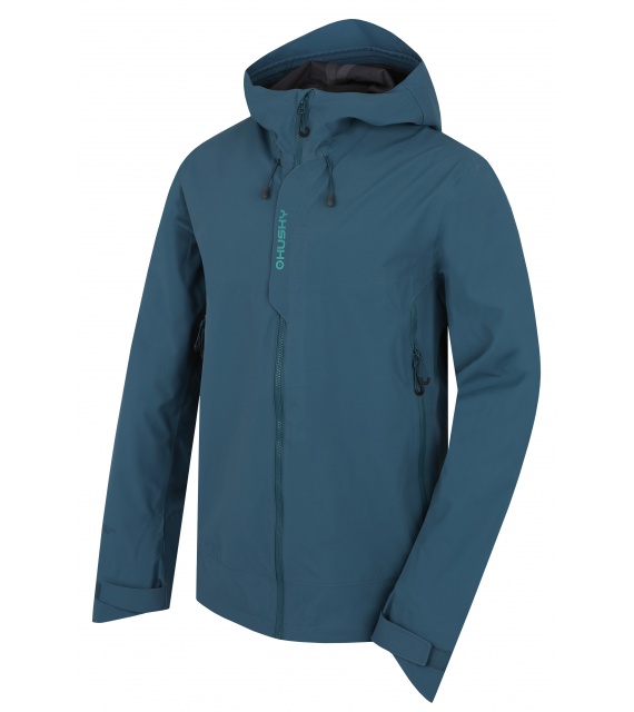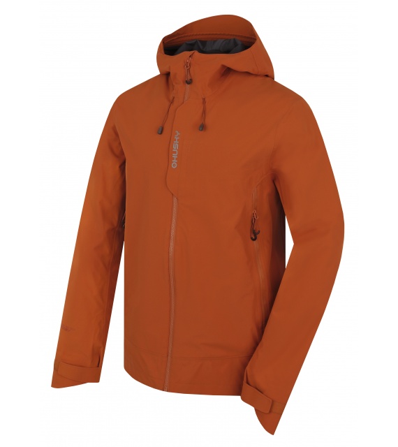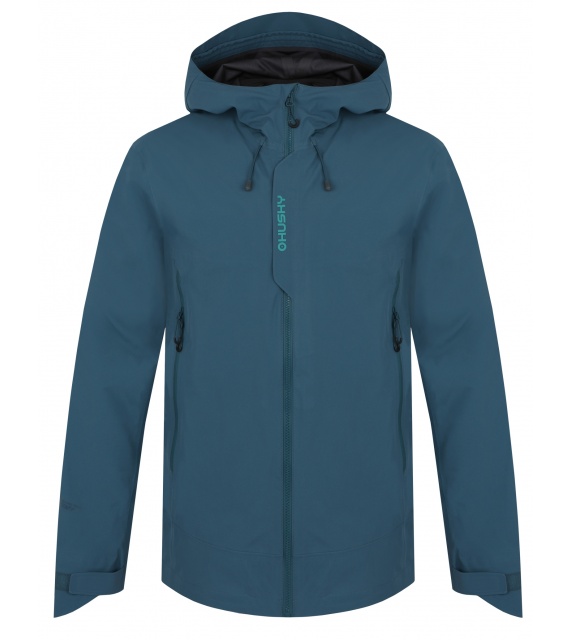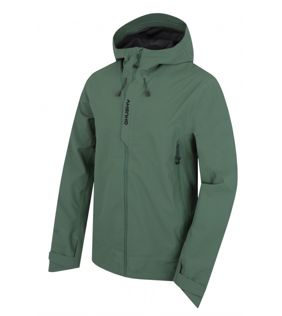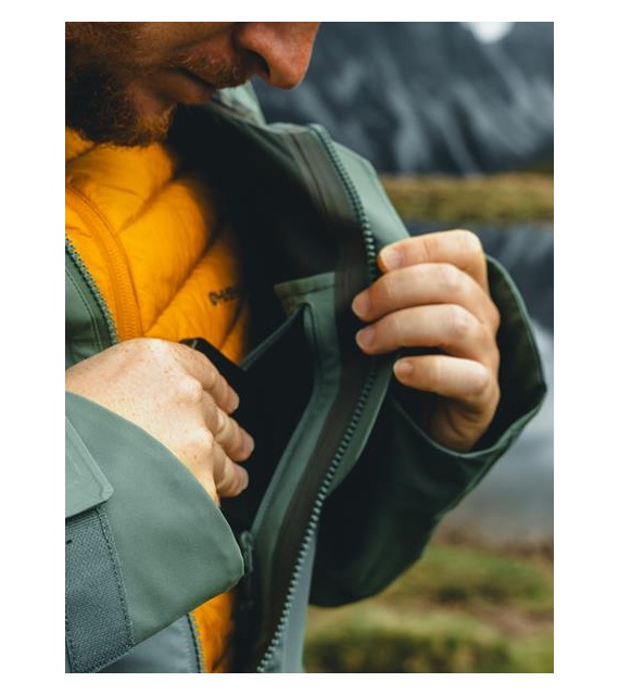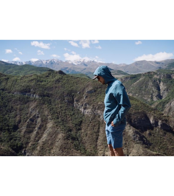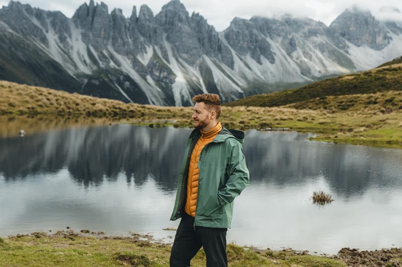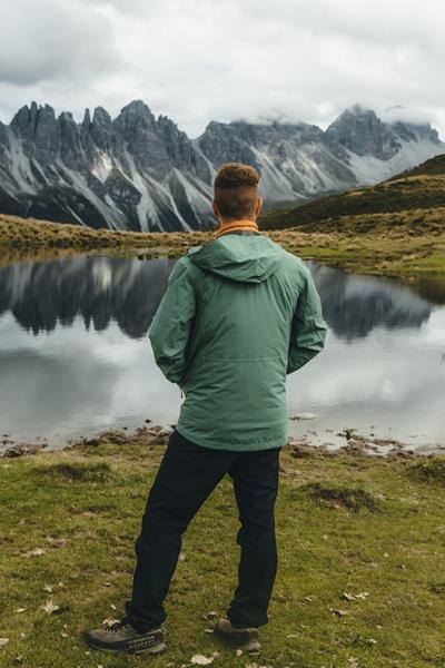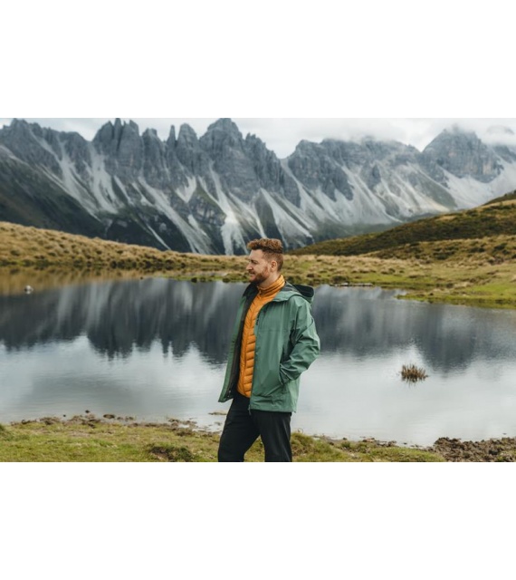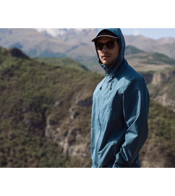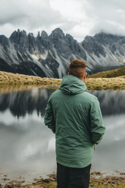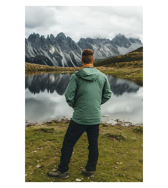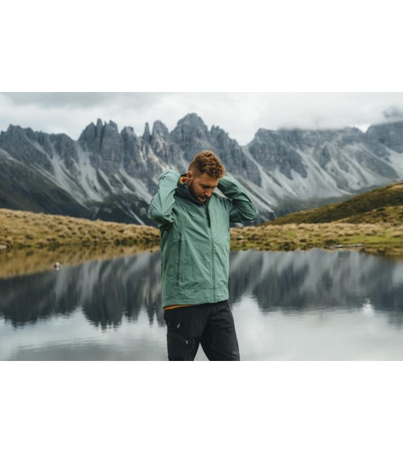 A versatile men's outdoor jacket with a hood for year-round use, suitable for both city wear and hiking in nature.