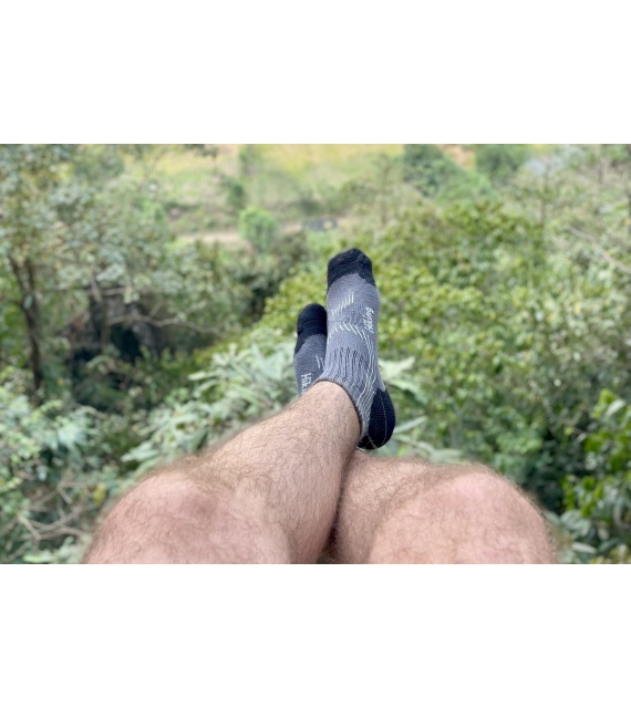 These Hiking socks are made of 66% bamboo fibre, which is a natural material characterized by excellent breathability, great absorption and thermoregulation properties, and a cooling effect. The fibre is also antibacterial and antiallergenic, so it provides comfort during normal everyday wear as well as when doing sports. The bamboo fibre is supplemented with 23% cotton, 8% polyamide and 3% elastane.