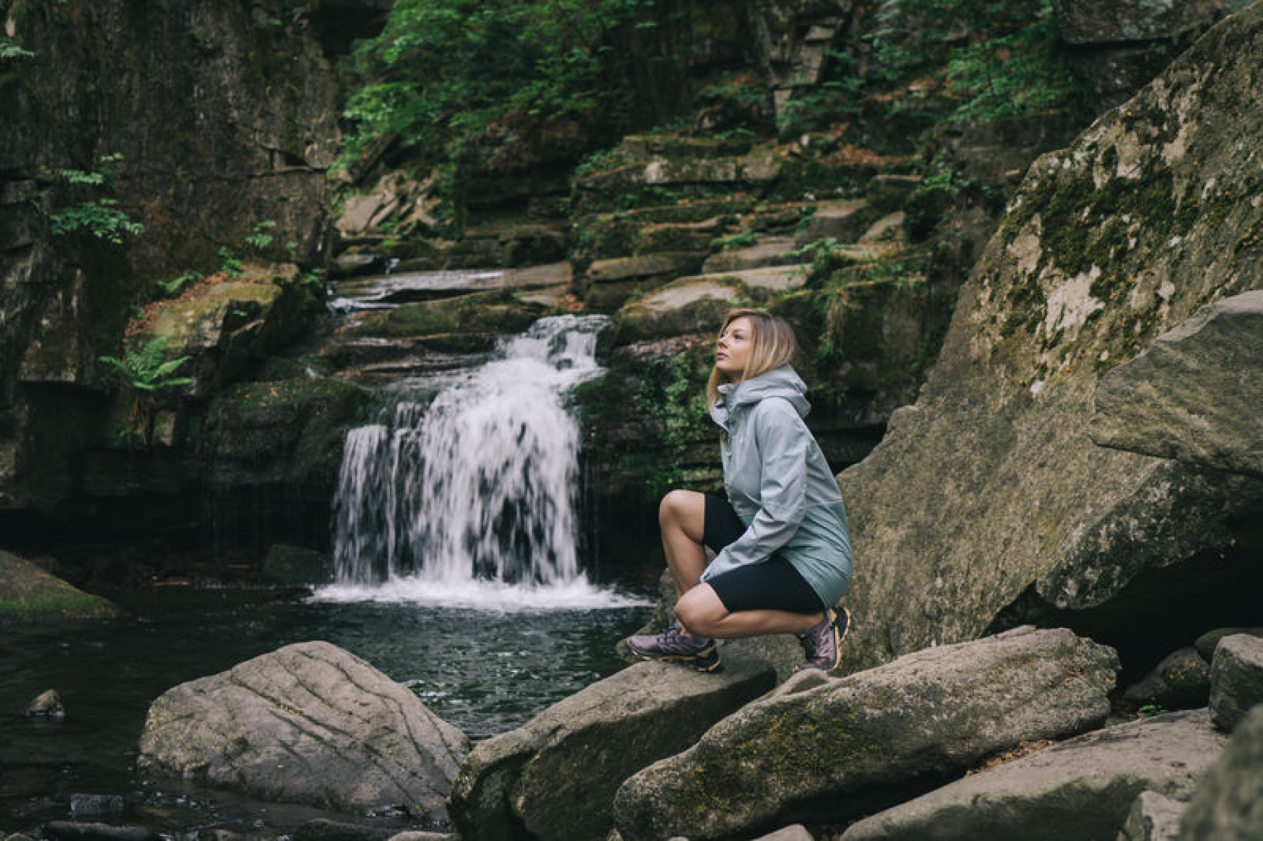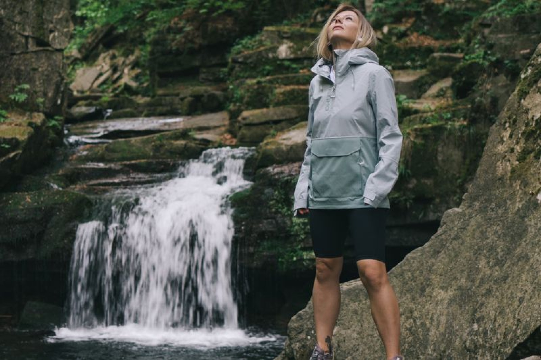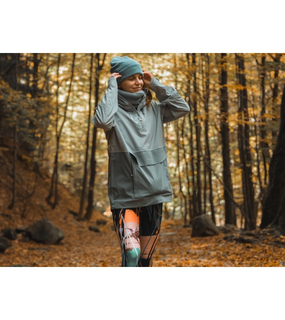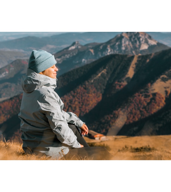 Multifunctional women’s outdoor jacket with a hood for year-round use in harsh conditions, whether in the countryside for hiking or in the city.