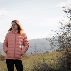 A women’s lightweight jacket with a hood for wearing on cold days around town and in the country.