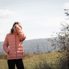 A women’s lightweight jacket with a hood for wearing on cold days around town and in the country.